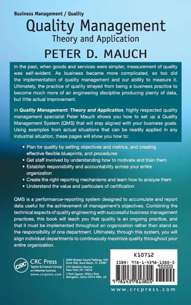 Quality is not an engineering discipline, but a business practice. Dr. Peter D. Mauch offers his expertise in this groundbreaking book, demonstrating the necessity of quality as a sustained management activity. Divided into five sections, the book covers staffing, motivation, control, planning, and organization. It offers quality management practices and discusses the impact of managing for quality throughout an organization. The book addresses the alignment of individual departments to maximize quality, business planning and success metrics, record keeping, and department level quality control implementation and deviations.