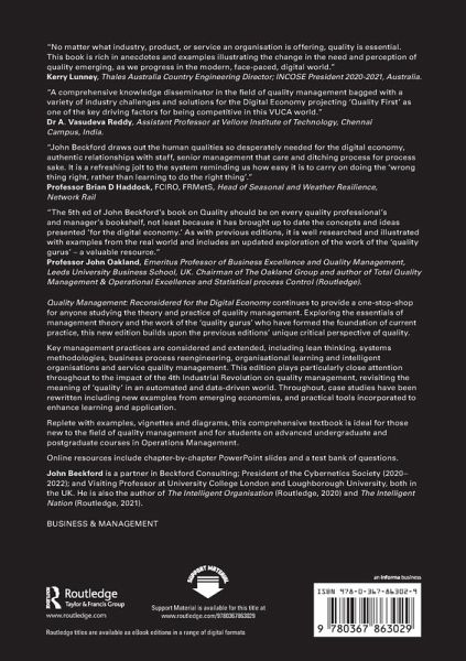 "The 5th ed of John Beckford's book on Quality should be on every quality professional's and manager's bookshelf, not least because it has brought up to date the concepts and ideas presented 'for the digital economy.' As with previous editions, it is well researched and illustrated with examples from the real world and includes an updated exploration of the work of the 'quality gurus' - a valuable resource."