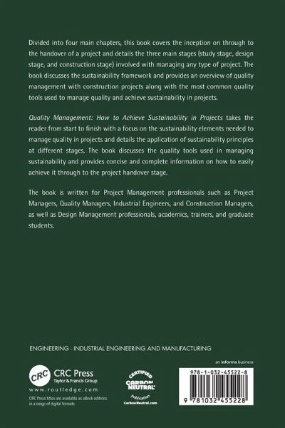 Divided into four main chapters, the book discusses the sustainability framework and provides an overview of quality management with construction projects along with the most common quality tools used to manage quality and achieve sustainability in projects.