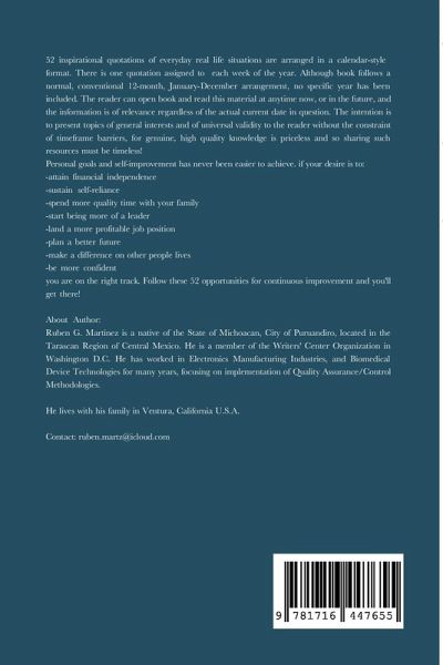 52 Self help, inspirational quotations dealing with everyday real life situations are arranged in a calendar-style type of format. There is one quotation assigned to each week of the year. Although book follows a normal, conventional 12-month, January-December arrangement, no specific year has been included. The idea is that the reader can open book and read this material at any time now, or in the future, and the information will appear to be of relevance regardless of the actual current date in question. The intention is to present topics of general interests and of universal validity to the reader without the constraint of timeframe barriers for genuine, high quality knowledge is priceless, and so sharing such resources must be timeless!