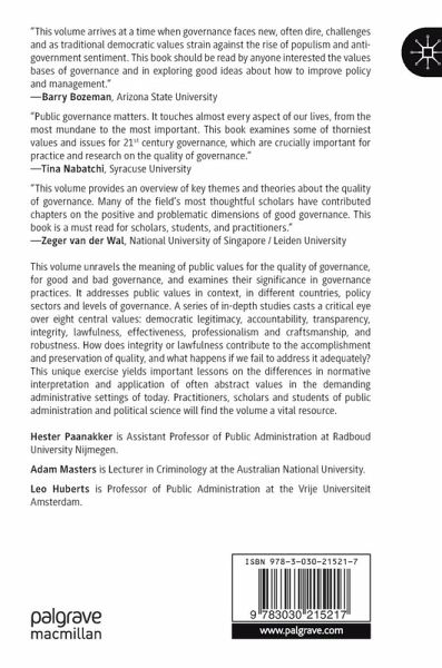 "Public governance matters. It touches almost every aspect of our lives, from the most mundane to the most important, the most commonplace to the most intimate. This book critically examines some of thorniest values and issues for governance in the 21st century -- democracy, legitimacy, accountability, transparency, integrity, professionalism, and more -- all of which are of crucial importance for practice and research on the quality of governance."Tina Nabatchi, Syracuse University, USA, Co-Chair of the Study Group 'Quality of Governance' of the International Institute of Administrative Sciences.