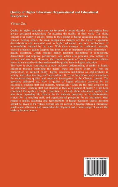 Quality in higher education was not invented in recent decades - universities have always possessed mechanisms for assuring the quality of their work. The rising concern over quality is closely related to the changes in higher education and its social context. Among others, the most conspicuous changes are the massive expansion, diversification and increased cost in higher education, and new mechanisms of accountability initiated by the state. With these changes the traditional internally enacted academic quality-keeping has been given an important external dimension - quality assurance, which requires higher education institutions to continuously demonstrate and improve performance, and which also provides new systems of rewards and sanctions. However, the complex impacts of quality assurance policies have shown a need to further understand the quality issue in higher education. This book is about constructing a more inclusive understanding of quality in higher education through combining the macro, meso and micro levels, i.e. from the perspectives of national policy, higher education institutions as organizations in society, individual teaching staff and students. It covers both theoretical constructions for understanding quality and empirical investigation in the Chinese context. The questions addressed are: How is quality of higher education perceived by the institution, teaching staff and students, respectively? What are the main concerns for the institution, teaching staff and students in their own pursuit of quality? It has been concluded that quality of higher education is not only about educational quality, but also about expanding life chances for the students, prosperity in the administrative system for the teaching staff,and organizational prosperity for the institution. With regard to quality assurance and accountability in higher education special attention should be given to the values pursued and be careful to balance between immediate, single-value efficiency and sustainable development and a wider-range of values that higher education serves.