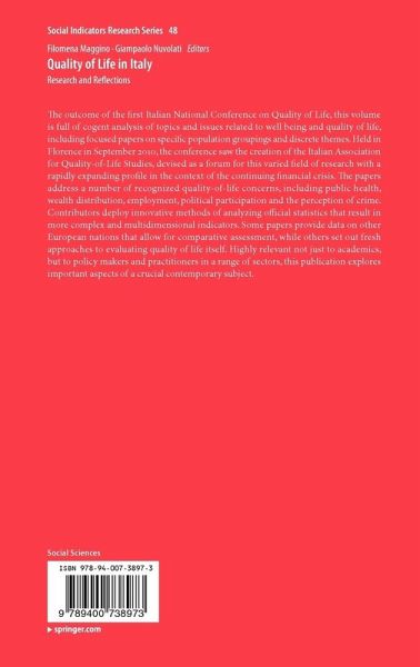 Introduction - (Filomena Maggino and Giampaolo Nuvolati).- I. Quality of Life: Methodological Aspects.- 1. Measuring equitable and sustainable wellbeing in Italy - (Enrico Giovannini and Tommaso Rondinella).- 2. A Non-Compensatory Approach for the Measurement of the Quality of Life - (Matteo Mazziotta and Adriano Pareto).- 3. From composite indicators to partial orders: evaluating socio-economic phenomena through ordinal data - (Marco Fattore, Filomena Maggino and Emilio Colombo).- 4. Light and shade of multidimensional Indexes: how methodological choices impact on empirical results - (Enrica Chiappero and Nadia von Jacobi Nadia).- II. Quality of Life and Social Change through Italian Official Statistics Social and demographic changes in Italy - (Linda Laura Sabbadini).- 5. Satisfied or dissatisfied? An analysis of the results of "Aspects of Daily Life" Italian survey on households - (Silvia Montecolle and Sante Orsini).- 6. The quality of life measured through the subjective indicators of safety: fear, worry about crime and the risk of criminality - (Maria Giuseppina Muratore, Alessandra Federici and Daria Squillante).- 7. Hours of work and life quality - (Maria Clelia Romano and Daniele Spizzichino).- III. Quality of Life, Public Administration and Civil Society.- 8. Civic evaluation as a tool for analysing and achieving quality of life under the citizen's point of view - (Angelo Tanese and Alessio Terzi).- 9. Security, quality of life and development. A holistic approach - (Maurizio Sajeva).- 10. Democracy and Public Knowledge. An Issue for Social Indicators - (Paolo Parra Saiani).- 11. Flexicurity and Workers Well-Being in Europe: Is Temporary Employment Always Bad? - (Federica Origo and Laura Pagani).- IV. Health Related Quality-of-Life.- 12. From a concept's evolution analysis to the definition of a new methodological evaluation tool of Health Related Quality-of-Life (HRQoL) questionnaires - (Francesca Ierardi, Lisa Gnaulati, Stefania Rodella and Elena Ruviglioni).- 13. The use of Health Related Quality of Life measures in Official statistics: the Italian experience - (Lidia Gargiulo, Laura Iannucci and Alessandra Tinto).- 14. Individual and family quality of life in intellectual disability: a challenging relationship - (Marco Bertelli, Annamaria Bianco, Daniela Scuticchio and Ivan Brown).