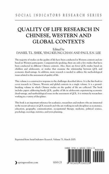 This volume is a constructive response to the challenges described above. It is the first book to cover research in Chinese, Western and global contexts in a single volume. It is a ground-breaking volume in which Chinese studies on the quality of life are collected. The book includes papers addressing family QOL, quality of life in adolescents experiencing economic disadvantage, and methodological issues in the assessment of QOL. It is written by researchers working in a variety of disciplines.