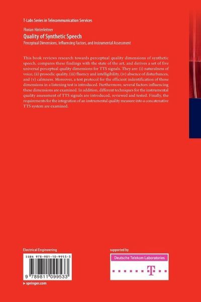 This book reviews research towards perceptual quality dimensions of synthetic speech, compares these findings with the state of the art, and derives a set of five universal perceptual quality dimensions for TTS signals. They are: (i) naturalness of voice, (ii) prosodic quality, (iii) fluency and intelligibility, (iv) absence of disturbances, and (v) calmness. Moreover, a test protocol for the efficient indentification of those dimensions in a listening test is introduced. Furthermore, several factors influencing these dimensions are examined. In addition, different techniques for the instrumental quality assessment of TTS signals are introduced, reviewed and tested. Finally, the requirements for the integration of an instrumental quality measure into a concatenative TTS system are examined.