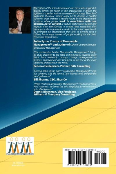 A vehicle for aligning the entire organization behind the sales department to deliver measurable outcomes. Everyone in the organization should see themselves as part of the sales department. Those who don't are part of the sales prevention department. This book is the sales version of "Cultural Change Through Measurable Management" by Robin Byrne and although it is essentially 85% the same book, it will be of more interest and value to readers with a Sales and Marketing background.