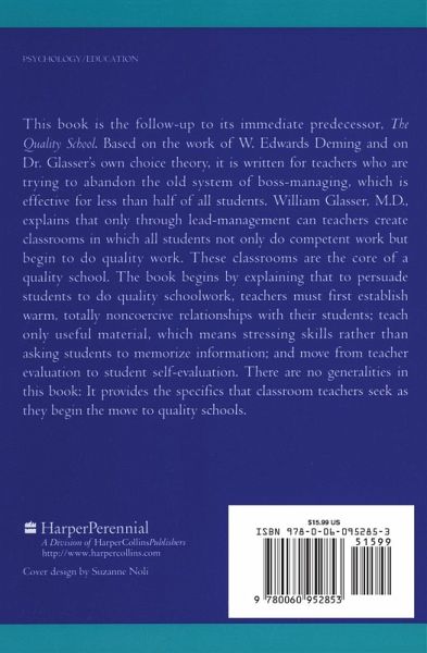 This book is the follow-up to its immediate predecessor, "The Quality School." Based on the work of W. Edwards Deming and on Dr. Glasser's own choice theory, it is written for teachers who are trying to abandon the old system of boss-managing, which is effective for less than half of all students. William Glasser, M.D., explains that only through lead-management can teachers create classrooms in which all students not only do competent work but begin to do quality work. These classrooms are the core of a quality school. The book begins by explaining that to persuade students to do quality schoolwork, teachers must first establish warm, totally noncoercive relationships with their students; teach only useful material, which means stressing skills rather than asking students to memorize information; and move from teacher evaluation to student self-evaluation. There are no generalities in this book: It provides the specifics that classroom teachers seek as they begin the move to quality schools.