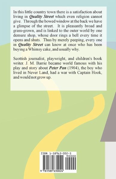 The scene is the blue and white room in the house of the Misses Susan and Phoebe Throssel in Quality Street; and in this little country town there is a satisfaction about living in Quality Street which even religion cannot give. Through the bowed window at the back we have a glimpse of the street. It is pleasantly broad and grass-grown, and is linked to the outer world by one demure shop, whose door rings a bell every time it opens and shuts. Thus by merely peeping, every one in Quality Street can know at once who has been buying a Whimsy cake, and usually why. This bell is the most familiar sound of Quality Street. Now and again ladies pass in their pattens, a maid perhaps protecting them with an umbrella, for flakes of snow are falling discreetly. Gentlemen in the street are an event; but, see, just as we raise the curtain, there goes the recruiting sergeant to remind us that we are in the period of the Napoleonic wars. If he were to look in at the window of the blue and white room all the ladies there assembled would draw themselves up; they know him for a rude fellow who smiles at the approach of maiden ladies and continues to smile after they have passed. However, he lowers his head to-day so that they shall not see him, his present design being converse with the Misses Throssel's maid.The room is one seldom profaned by the foot of man, and everything in it is white or blue. Miss Phoebe is not present, but here are Miss Susan, Miss Willoughby and her sister Miss Fanny, and Miss Henrietta Turnbull. Miss Susan and Miss Willoughby, alas, already wear caps; but all the four are dear ladies, so refined that we ought not to be discussing them without a more formal introduction. There seems no sufficient reason why we should choose Miss Phoebe as our heroine rather than any one of the others, except, perhaps, that we like her name best. But we gave her the name, so we must support our choice and say that she is slightly the nicest, unless, indeed, Miss Susan is nicer.Miss Fanny is reading aloud from a library book while the others sew or knit. They are making garments for our brave soldiers now far away fighting the Corsican Ogre.