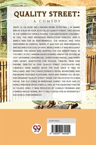 Prior to his more well-known work, Peter Pan, J. M. Barrie wrote a play in four acts called Quality Street. Two sisters in the narrative open a school "for aristocratic children." In 1901, the first Broadway production debuted, and it barely ran for 64 performances. The musical was then performed in London, where it ran for 459 performances and became a success. Up until World War II, it was regularly renewed. The drama was adapted for the screen twice; in the first, in 1927, Marion Davies starred, and in the second, in 1937, Katharine Hepburn did. Christopher Hassall and Harry Parr Davies' adaptation for musical theater, Dear Miss Phoebe, debuted in 1950. Quality Street chocolates and caramels were named after the play since it was so well-liked, and the confectionery's initial advertising and packaging featured playgoers. Hicks and Terriss' cul-de-sac was renamed "Quality Street" when they relocated to a new house, The Old Forge in Merstham, Surrey. The play had its world premiere on October 11, 1901, at the Valentine Theatre in Toledo, Ohio. It was produced by Charles Frohman and starred Maude Adams, but it only lasted for 64 moderately successful performances.