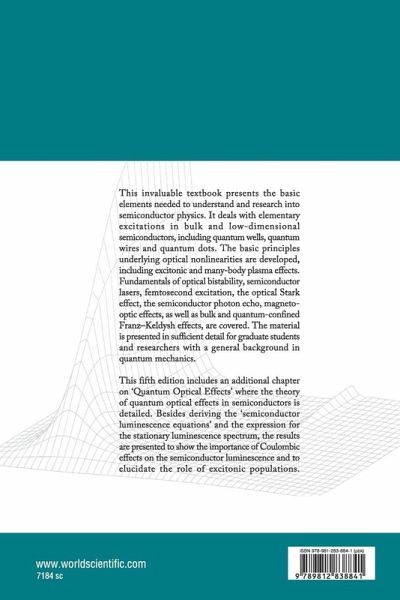This invaluable textbook presents the basic elements needed to understand and research into semiconductor physics. It deals with elementary excitations in bulk and low-dimensional semiconductors, including quantum wells, quantum wires and quantum dots. The basic principles underlying optical nonlinearities are developed, including excitonic and many-body plasma effects. Fundamentals of optical bistability, semiconductor lasers, femtosecond excitation, the optical Stark effect, the semiconductor photon echo, magneto-optic effects, as well as bulk and quantum-confined Franz-Keldysh effects, are covered. The material is presented in sufficient detail for graduate students and researchers with a general background in quantum mechanics.This fifth edition includes an additional chapter on 'Quantum Optical Effects' where the theory of quantum optical effects in semiconductors is detailed. Besides deriving the 'semiconductor luminescence equations' and the expression for the stationary luminescence spectrum, results are presented to show the importance of Coulombic effects on the semiconductor luminescence and to elucidate the role of excitonic populations.