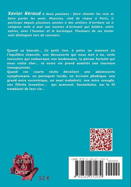 Quand ça bascule... Ce petit rien, parfois, à peine un moment où l'équilibre chancelle. La découverte qui nous met à nu, cette rencontre qui embarrasse nos lendemains, la phrase fortuite qui nous coûte cher... et notre vie prend aussitôt une tournure insoupçonnée. Quand ces courts récits... Dévoilent et découvrent, une adolescente nymphomane, un perroquet lucide, un écrivain phobique, une grand-mère excentrique, un mari maladroit, une mère aveugle, une fillette très inventive, clowns, curés, commissaires, villageois affolés et citadins embourgeoisés, avancent, funambules sur le fil tremblant de leur vie. Et puis un jour...