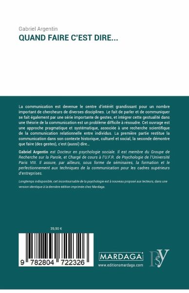 La communication est devenue le centre d¿intérêt grandissant pour un nombre important de chercheurs de diverses disciplines. Le fait de parler et de communiquer se fait également par une série importante de gestes, et intégrer cette gestualité dans une théorie de la communication est un problème difficile à résoudre. Cet ouvrage est une approche pragmatique et systématique, associée à une recherche scientifique de la communication relationnelle entre individus. La première partie restitue la communication dans son contexte historique, culturel et social, la seconde démontre que faire (des gestes), c¿est (aussi) dire¿ Gabriel Argentin est Docteur en psychologie sociale. Il est membre du Groupe de Recherche sur la Parole, et Chargé de cours à l¿U.F.R. de Psychologie de l¿Université Paris VIII. Il assure, par ailleurs, sous forme de séminaires, la formation et le perfectionnement aux techniques de la communication pour les cadres supérieurs d¿entreprises.