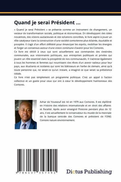 « Quand je serai Président » se présente comme un instrument de changement, un vecteur de transformation sociale, politique et économique. En développant des idées novatrices, des visions audacieuses et des solutions concrètes, le livre aspire à jouer un rôle catalyseur dans la construction d'une société comorienne plus éclairée, équitable et prospère. Il s'agit d'un effort délibéré pour émanciper les esprits, mobiliser les énergies et forger un consensus autour d'une vision commune d'avenir pour les Comores.Ce livre est dédié à ceux qui sont actuellement aux commandes des destinées communales, aux visionnaires politiques, aux entreprises publiques et privées qui jouent un rôle essentiel dans la prospérité de nos communautés. Il s'adresse également à tous les hommes et femmes qui nourrissent des rêves d'un avenir radieux pour leur pays, aux étudiants et scolaires qui sont les bâtisseurs en herbe de demain, ainsi qu'à toute personne qui, ne serait-ce qu'un instant, a imaginé ce que serait sa présidence idéale.Ce livre n'est pas simplement un programme politique. C'est un appel à l'action collective et un guide pour ceux qui ont à coeur le développement harmonieux des Comores.