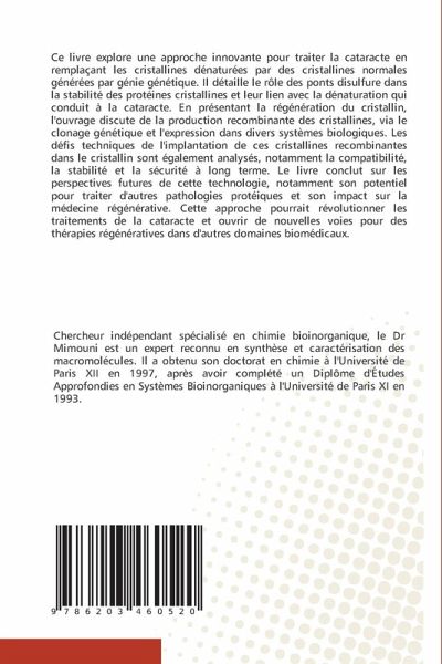 Ce livre explore une approche innovante pour traiter la cataracte en remplaçant les cristallines dénaturées par des cristallines normales générées par génie génétique. Il détaille le rôle des ponts disulfure dans la stabilité des protéines cristallines et leur lien avec la dénaturation qui conduit à la cataracte. En présentant la régénération du cristallin, l'ouvrage discute de la production recombinante des cristallines, via le clonage génétique et l'expression dans divers systèmes biologiques. Les défis techniques de l'implantation de ces cristallines recombinantes dans le cristallin sont également analysés, notamment la compatibilité, la stabilité et la sécurité à long terme. Le livre conclut sur les perspectives futures de cette technologie, notamment son potentiel pour traiter d'autres pathologies protéiques et son impact sur la médecine régénérative. Cette approche pourrait révolutionner les traitements de la cataracte et ouvrir de nouvelles voies pour des thérapies régénératives dans d'autres domaines biomédicaux.