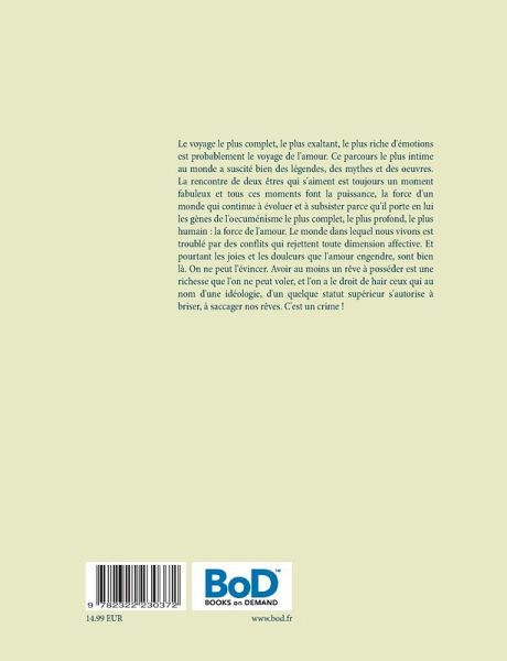 Le voyage le plus complet, le plus exaltant, le plus riche d'émotions est probablement le voyage de l'amour. Ce parcours le plus intime au monde a suscité bien des légendes, des mythes et des oeuvres. La rencontre de deux êtres qui s'aiment est toujours un moment fabuleux et tous ces moments font la puissance, la force d'un monde qui continue à évoluer et à subsister parce qu'il porte en lui les gènes de l'oecuménisme le plus complet, le plus profond, le plus humain : la force de l'amour. Le monde dans lequel nous vivons est troublé par des conflits qui rejettent toute dimension affective. Et pourtant les joies et les douleurs que l'amour engendre, sont bien là. On ne peut l'évincer. Sur le chemin de son instinct, l'Homme se construit des quêtes qui quand elles ne sont pas réalisables deviennent des rêves. La quête est parfois lourde à porter, les rêves sont légers et pleins d'espoir. Avoir au moins un rêve à posséder est une richesse que l'on ne peut voler, et l'on a le droit de hair ceux qui au nom d'une idéologie, d'un quelque statut supérieur s'autorise à briser, à saccager nos rêves. C'est un crime !