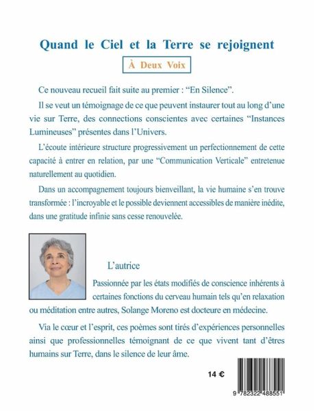 Ce recueil de poèmes fait suite au précédent "En Silence". Au travers d'une écoute affinée au fil du temps, via le coeur et l'esprit arrivent des prémices d'échanges : la démarche humaine est validée dans l'Univers et le contact est établi...Sous la forme de réponses, commentaires, enseignements tous azimuts, des "Énergies Lumineuses et Bienveillantes" se manifestent spontanément : Elles éclairent, réconfortent, encouragent tandis qu'une force nouvelle est générée en soi.Intégrant cette Voie inédite on ose enfin la confiance, avec patience et persévérance, acceptant peu à peu "l'Incroyable", "l'Impossible : cela très naturellement, en s'y habituant au quotidienLa vie s'accomplit la Joie au coeur : à chaque instant aide, accompagnement, guidance se manifestent encore et encore, de multiples manières et toujours des plus adaptées...Au sein d'une immense gratitude, ces échanges transforment celles et ceux qui s'y prêtent du plus profond de leur âme, avec au coeur un seul souhait : « Que cela dure . . . Toujours ».Ce livre est le deuxième opus de la collection " Quand le Ciel et la Terre se rejoignent". Il est proposé également en grand format (A4-21/29.7) et GROS CARACTÈRES ainsi qu'en e-book.