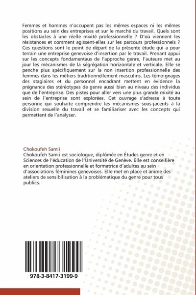 Femmes et hommes n occupent pas les mêmes espaces ni les mêmes positions au sein des entreprises et sur le marché du travail. Quels sont les obstacles à une réelle mixité professionnelle ? D où viennent les résistances et comment agissent-elles sur les parcours professionnels ? Ces questions sont le point de départ de la présente étude qui a pour terrain une entreprise genevoise d insertion par le travail. Prenant appui sur les concepts fondamentaux de l approche genre, l auteure met au jour les mécanismes de la ségrégation horizontale et verticale. Elle se penche plus spécifiquement sur la non insertion professionnelle des femmes dans les métiers traditionnellement masculins. Les témoignages des stagiaires et du personnel encadrant mettent en évidence la prégnance des stéréotypes de genre aussi bien au niveau des individus que de l entreprise. Des pistes pour aller vers une plus grande mixité au sein de l entreprise sont explorées. Cet ouvrage s adresse à toute personne qui souhaite comprendre les mécanismes sous-jacents à la division sexuelle du travail et se familiariser avec les concepts qui permettent de l analyser.