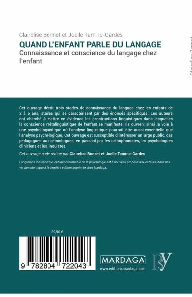 Cet ouvrage décrit trois stades de connaissance du langage chez les enfants de 2 à 6 ans, stades qui se caractérisent par des énoncés spécifiques. Les auteurs ont cherché à mettre en évidence les constructions linguistiques dans lesquelles la conscience métalinguistique de l'enfant se manifeste. Ils ouvrent ainsi la voie à une psycholinguistique où l'analyse linguistique pourrait être aussi essentielle que l'analyse psychologique. Cet ouvrage est susceptible d'intéresser un large public, des pédagogues aux sémiologues, en passant par les orthophonistes, les psychologues cliniciens et les linguistes. Clairelise Bonnet et Joelle Tamine-Gardes ont collaboré à cet ouvrage.