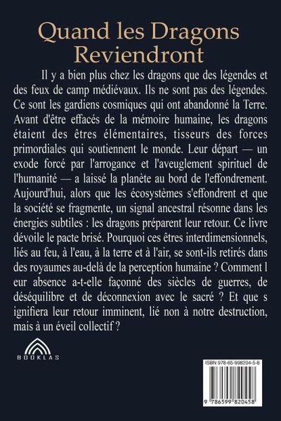 Quand les Dragons ReviendrontGuide Ésotérique pour le Nouvel Âge Par Michael Turner Il y a bien plus chez les dragons que des légendes et des feux de camp médiévaux. Ils ne sont pas des légendes. Ce sont les gardiens cosmiques qui ont abandonné la Terre. Avant d'être effacés de la mémoire humaine, les dragons étaient des êtres élémentaires, tisseurs des forces primordiales qui soutiennent le monde. Leur départ - un exode forcé par l'arrogance et l'aveuglement spirituel de l'humanité - a laissé la planète au bord de l'effondrement. Aujourd'hui, alors que les écosystèmes s'effondrent et que la société se fragmente, un signal ancestral résonne dans les énergies subtiles : les dragons préparent leur retour. Ce livre dévoile le pacte brisé. Pourquoi ces êtres interdimensionnels, liés au feu, à l'eau, à la terre et à l'air, se sont-ils retirés dans des royaumes au-delà de la perception humaine ? Comment leur absence a-t-elle façonné des siècles de guerres, de déséquilibre et de déconnexion avec le sacré ? Et que signifiera leur retour imminent, lié non à notre destruction, mais à un éveil collectif ? À travers des mythes oubliés, des textes hermétiques et des récits de visions contemporaines, découvrez : L'appel est dans l'air. Dans les eaux. Dans le feu des crises qui consument le monde. Reste à savoir si l'humanité s'éveillera... ou deviendra à son tour un mythe oublié. Mots-clés : dragons énergie spirituelle; connexion dragons méditation; éveil conscience draconique; portails énergétiques interdimensionnels; rituels dragons anciens; éléments nature dragons; protection planétaire draconique; dragons feu transformation; dragons gardiens sagesse; dragon alchimie transmutation.