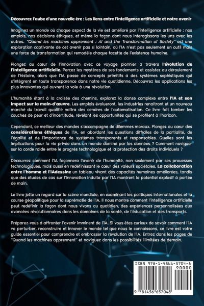 Découvrez l'aube d'une nouvelle ère : Les liens entre l'intelligence artificielle et notre avenir Imaginez un monde où chaque aspect de la vie est amélioré par l'intelligence artificielle : nos emplois, nos décisions éthiques, et même la façon dont nous interagissons les uns avec les autres. "Quand les machines apprennent : AI and the Transformation of Society" est une exploration captivante de cet avenir pas si lointain, où l'IA n'est pas seulement un outil mais une force de transformation qui remodèle chaque facette de l'existence humaine. Plongez au c¿ur de l'innovation avec ce voyage pionnier à travers l'évolution de l'intelligence artificielle. Percez les mystères de ses fondements et assistez au déroulement de l'histoire, alors que l'IA passe de concepts primitifs à des systèmes sophistiqués qui s'intègrent en toute transparence dans notre vie quotidienne. Découvrez les applications les plus innovantes qui ouvrent la voie à une révolution. L'humanité étant à la croisée des chemins, explorez la danse complexe entre l'IA et son impact sur la main-d'¿uvre. Les emplois évolueront, les industries renaîtront et un nouveau marché du travail qualifié naîtra des cendres de l'automatisation. Ce livre fait tomber les couches de peur et d'incertitude, révélant les opportunités qui se profilent à l'horizon. Cependant, ce meilleur des mondes s'accompagne de dilemmes moraux. Plongez au c¿ur des considérations éthiques de l'IA, en abordant les questions difficiles de la partialité, de l'égalité et de l'importance de systèmes transparents et responsables. Quelles sont les implications pour la vie privée dans un monde dominé par les données ? Comment naviguer sur la corde raide entre le progrès technologique et la protection des droits individuels ? Découvrez comment l'IA façonnera l'avenir de l'humanité, non seulement par ses prouesses technologiques, mais aussi en redéfinissant le c¿ur des valeurs sociétales. La collaboration entre l'homme et l'IAdessine un tableau vivant des capacités humaines améliorées, tandis que des études de cas sur l'innovation induite par l'IA montrent le potentiel explosif à portée de main. Le livre jette un regard sur la scène mondiale, en examinant les politiques internationales et la course géopolitique pour la suprématie de l'IA. Il nous montre comment l'intelligence artificielle peut redéfinir la façon dont nous vivons au quotidien, des expériences personnalisées aux avancées révolutionnaires dans les domaines de la santé, de l'éducation et des transports. Préparez-vous à affronter l'avenir imminent de l'IA. Si vous êtes curieux de savoir comment l'IA va perturber, reconstruire et innover le monde tel que nous le connaissons, ce livre est votre guide essentiel pour comprendre et embrasser la révolution de l'IA. Entrez dans les pages de "Quand les machines apprennent" et naviguez dans les possibilités illimitées de demain.