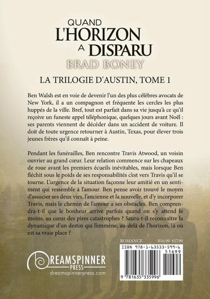 La trilogie d'Austin, tome 1 Ben Walsh est en voie de devenir l'un des plus célèbres avocats de New York, il a un compagnon et fréquente les cercles les plus huppés de la ville. Bref, tout est parfait dans sa vie jusqu'à ce qu'il reçoive un funeste appel téléphonique, quelques jours avant Noël : ses parents viennent de décéder dans un accident de voiture. Il doit de toute urgence retourner à Austin, Texas, pour élever trois jeunes frères qu'il connaît à peine. Pendant les funérailles, Ben rencontre Travis Atwood, un voisin ouvrier au grand cœur. Leur relation commence sur les chapeaux de roue avant les premiers écueils inévitables, mais lorsque Ben fléchit sous le poids de ses responsabilités c'est vers Travis qu'il se tourne. L'urgence de la situation façonne leur amitié en un sentiment qui ressemble à l'amour. Ben pense avoir trouvé le moyen d'associer ses deux vies, l'ancienne et la nouvelle, et d'y incorporer Travis, mais le chemin de l'amour a ses obstacles. Ben comprendra-t-il que le bonheur arrive parfois quand on s'y attend le moins, au cœur des pires catastrophes ? Saura-t-il reconnaître la dynamique d'un destin qui l'emmène, au-delà de l'horizon, là où est sa vraie place ?