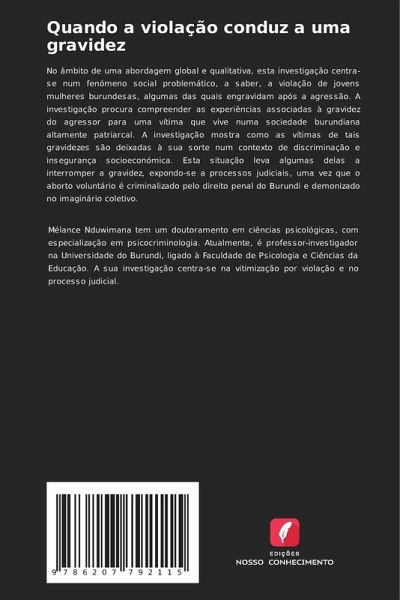 No âmbito de uma abordagem global e qualitativa, esta investigação centra-se num fenómeno social problemático, a saber, a violação de jovens mulheres burundesas, algumas das quais engravidam após a agressão. A investigação procura compreender as experiências associadas à gravidez do agressor para uma vítima que vive numa sociedade burundiana altamente patriarcal. A investigação mostra como as vítimas de tais gravidezes são deixadas à sua sorte num contexto de discriminação e insegurança socioeconómica. Esta situação leva algumas delas a interromper a gravidez, expondo-se a processos judiciais, uma vez que o aborto voluntário é criminalizado pelo direito penal do Burundi e demonizado no imaginário coletivo.