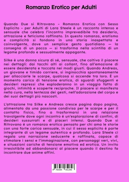 Quando Due si Ritrovano - Romanzo Erotico con Sesso Esplicito - per Adulti di Lara Steele è un racconto intenso e sensuale che celebra l'incontro imprevedibile tra desiderio, attrazione e feticismo raffinato. In questo romanzo, erotismo e complicità si fondono in una storia inaspettata e coinvolgente, dove un semplice gesto quotidiano - la consegna di un pacco - si trasforma nella scintilla di un legame profondo e sessualmente appagante.Silke è una donna sicura di sé, sensuale, che coltiva il piacere nei dettagli: dai tacchi alti ai collant, fino all'emozione di essere desiderata e toccata nei modi giusti. Quando Andreas, un giovane e timido corriere, si inginocchia spontaneamente per allacciarle le scarpe, qualcosa si accende tra loro. È un momento carico di tensione erotica, di sguardi sfuggenti e desideri repressi che esploderanno in un viaggio fatto di giochi, intimità e scoperte reciproche. Il piacere si manifesta nella cura, nella lentezza dei gesti, nell'adorazione del corpo e dei suoi dettagli più nascosti.L'attrazione tra Silke e Andreas cresce pagina dopo pagina, alimentata da una passione condivisa per le scarpe e per il contatto fisico, fino a trasformarsi in una relazione travolgente dove ogni incontro è un'esplorazione di confini, di desideri sussurrati e di piaceri intensi. Quando Due si Ritrovano è un romanzo erotico pensato per chi ama le storie con una forte carica sensuale, in cui il sesso esplicito è parte integrante di un legame autentico e profondo. Lara Steele ci regala una narrazione seducente e raffinata, capace di stimolare i sensi e l'immaginazione, con personaggi veri, vivi, e situazioni cariche di tensione emotiva ed erotica. Un invito irresistibile ad abbandonarsi al piacere quando il destino fa incontrare due anime affini.