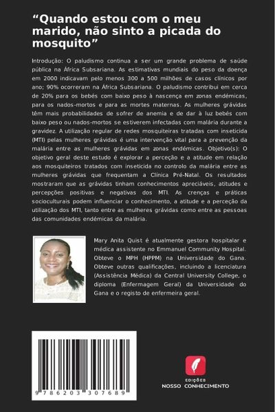 Introdução: O paludismo continua a ser um grande problema de saúde pública na África Subsariana. As estimativas mundiais do peso da doença em 2000 indicavam pelo menos 300 a 500 milhões de casos clínicos por ano; 90% ocorreram na África Subsariana. O paludismo contribui em cerca de 20% para os bebés com baixo peso à nascença em zonas endémicas, para os nados-mortos e para as mortes maternas. As mulheres grávidas têm mais probabilidades de sofrer de anemia e de dar à luz bebés com baixo peso ou nados-mortos se estiverem infectadas com malária durante a gravidez. A utilização regular de redes mosquiteiras tratadas com inseticida (MTI) pelas mulheres grávidas é uma intervenção vital para a prevenção da malária entre as mulheres grávidas em zonas endémicas. Objetivo(s): O objetivo geral deste estudo é explorar a perceção e a atitude em relação aos mosquiteiros tratados com inseticida no controlo da malária entre as mulheres grávidas que frequentam a Clínica Pré-Natal. Os resultados mostraram que as grávidas tinham conhecimentos apreciáveis, atitudes e percepções positivas e negativas dos MTI. As crenças e práticas socioculturais podem influenciar o conhecimento, a atitude e a perceção da utilização dos MTI, tanto entre as mulheres grávidas como entre as pessoas das comunidades endémicas da malária.