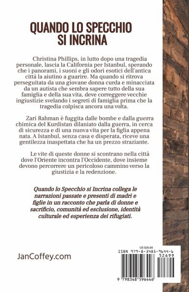 QUANDO LO SPECCHIO SI INCRINA Christina Phillips, in lutto dopo una tragedia personale, lascia la California per Istanbul, sperando che i panorami, i suoni e gli odori esotici dell'antica città la aiutino a guarire. Ma quando si ritrova perseguitata da una giovane donna curda e minacciata da un autista che sembra sapere tutto della sua famiglia e della sua vita, deve correggere vecchie ingiustizie svelando i segreti di famiglia prima che la tragedia colpisca ancora una volta. Zari Rahman è fuggita dalle bombe e dalla guerra chimica del Kurdistan dilaniato dalla guerra, in cerca di sicurezza e di una nuova vita per la figlia appena nata. A Istanbul, senza casa e disperata, riceve una gentilezza inaspettata che ha un prezzo straziante. Le vite di queste donne si scontrano nella città dove l'Oriente incontra l'Occidente, dove insieme devono percorrere un pericoloso cammino verso la giustizia e la redenzione. Quando lo Specchio si Incrina collega le narrazioni passate e presenti di madri e figlie in un racconto che parla di donne e sacrificio, comunità ed esclusione, identità culturale ed esperienza dei rifugiati.