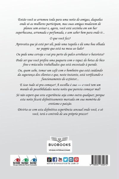 Então você se arrumou toda para uma noite de amigas, daquelas onde só as mulheres participam, mas suas amigas mudaram de planos sem avisar e, agora, você está sozinha em um bar superbacana, arrumada e perfumada, e sem saber bem para onde ir... O que você faz? Aproveita que já está por ali, pede uma tequila e dá uma boa olhada no yuppie que está na mesa ao lado? Ou pede uma cerveja e vai pra perto do palco arrebatar o baterista? Pode ser que você prefira uma paquera com o rapaz de botas de bico fino e músculos trabalhados que está encostado à parede. Ou, quem sabe, tomar um café com o bombeiro que está cuidando da segurança dos clientes e que, neste instante, está verificando o funcionamento do extintor... E isso tudo só pra começar! A escolha é sua - e você tem um mundo de possibilidades nesta noite que parecia começar mal!Só não espere que esta experiência seja como outra qualquer, porque esta noite ficará definitivamente marcada em sua memória de erotismo e paixão. Divirta-se com esta definitiva experiência sensual onde você, e só você, terá o controle de seu próprio prazer! Leitura recomendada para maiores de 18 anos.