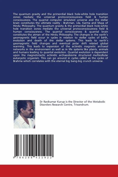 The quantum gravity and the primordial black hole-white hole transition zones mediate the universal protoconsciousness field & human consciousness. The quantal computer simulated universe and the stellar brain constitutes the ultimate reality - Brahman, Lila, Karma and Maya of Hindu Philosophy. The quantum gravity & the primordial black hole-white hole transition zones mediate the universal protoconsciousness field & human consciousness. The quantal consciousness & quantal brain constitutes the atman of the Hindu Philosophy. The changes in the earth's geomagnetic field occur in cycles in relation to stellar cycles of birth, evolution and death of the stellar systems. This leads to earth's geomagnetic field changes and eventual polar shift related global warming. This leads to expansion of the actinidic magnetic archaeal networks in the environment as well as in life systems like plants, animals and humans leading to quantal evolution. Quantal evolution is dependent upon the magnetotactic actinidic archaeobiome structured multicellular eukaryotic organism. This can go around in cycles called as the cycles of Brahma which correlates with the eternal big bang-big crunch universe.