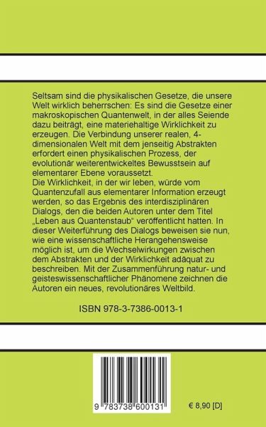 Seltsam sind die physikalischen Gesetze, die unsere Welt wirklich beherrschen: Es sind die Gesetze einer makroskopischen Quantenwelt, in der alles Seiende dazu beiträgt, eine materiehaltige Wirklichkeit zu erzeugen. Die Verbindung unserer realen, 4-dimensionalen Welt mit dem jenseitig Abstrakten erfordert einen physikalischen Prozess, der evolutionär weiterentwickeltes Bewusstsein auf elementarer Ebene voraussetzt. Die Wirklichkeit, in der wir leben, würde vom Quantenzufall aus elementarer Information erzeugt werden, so das Ergebnis des interdisziplinären Dialogs, den die beiden Autoren unter dem Titel "Leben aus Quantenstaub" veröffentlicht hatten. In dieser Weiterführung des Dialogs beweisen sie nun, wie eine wissenschaftliche Herangehensweise möglich ist, um die Wechselwirkungen zwischen dem Abstrakten und der Wirklichkeit adäquat zu beschreiben. Mit der Zusammenführung natur- und geisteswissenschaftlicher Phänomene zeichnen die Autoren ein neues, revolutionäres Weltbild.