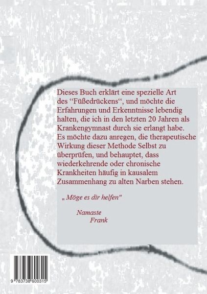 Dieses Buch erklärt eine spezielle Art des "Füßedrückens" und möchte die Erfahrungen und Erkenntnisse lebendig halten, die ich in den letzten 20 Jahren als Krankengymnast durch sie erlangt habe.Es möchte dazu anregen, die besondere Effektivität und die anhaltende therapeutische Wirkung dieser Methode selbst zu überprüfen, und behauptet, dass chronische Krankheiten in kausalem Zusammenhang zu alten Narben stehen.