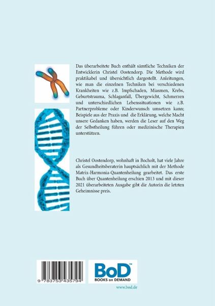 Das überarbeitete Buch enthält sämtliche Techniken der Entwicklerin Christel Oostendorp. Die Methode wird praktikabel und übersichtlich dargestellt. Anleitungen, wie man die einzelnen Techniken bei verschiedenen Krankheiten wie z.B. Impfschaden, Miasmen, Krebs, Geburtstrauma, Schlaganfall, Übergewicht, Schmerzen und unterschiedlichen Lebenssituationen wie z.B. Partnerprobleme oder Kinderwunsch einsetzen kann; Beispiele aus der Praxis und die Erklärung, welche Macht unsere Gedanken haben, werden die Leser auf den Weg der Selbstheilung führen oder medizinische Therapien unterstützen.