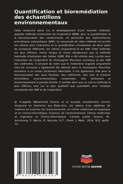 Cette recherche porte sur le développement d'une nouvelle méthode, appelée méthode d'extraction de l'ergostérol (EEM), pour la quantification et la biorestauration des contaminants, en particulier des hydrocarbures aromatiques polycycliques (HAP). La nouveauté de cette méthode est qu'elle est utilisée pour l'extraction et la quantification simultanées de deux types de composés différents, les stérols (ergostérol) et les HAP. Cette méthode est plus efficace, moins longue et moins dangereuse que la méthode habituelle d'extraction des lipides (LEM). Elle a été utilisée avec succès pour l'extraction de l'ergostérol du champignon Pleurotus ostreotus et des HAP des sédiments. Il convient de noter que le cholestérol (signalé uniquement chez les animaux) a également été détecté dans le champignon Pleurotus ostreotus à un niveau facilement détectable. Il est également utile pour la biorestauration des eaux fluviales, des sédiments, des sols et d'autres échantillons environnementaux contaminés, très facilement et économiquement à grande échelle. Il semble donc que ce soit la méthode la plus efficace, tant sur le plan qualitatif que quantitatif, pour l'analyse simultanée des HAP et de l'ergostérol.