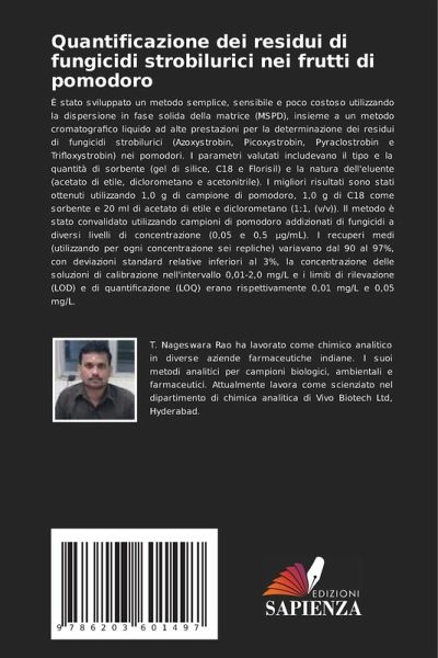 È stato sviluppato un metodo semplice, sensibile e poco costoso utilizzando la dispersione in fase solida della matrice (MSPD), insieme a un metodo cromatografico liquido ad alte prestazioni per la determinazione dei residui di fungicidi strobilurici (Azoxystrobin, Picoxystrobin, Pyraclostrobin e Trifloxystrobin) nei pomodori. I parametri valutati includevano il tipo e la quantità di sorbente (gel di silice, C18 e Florisil) e la natura dell'eluente (acetato di etile, diclorometano e acetonitrile). I migliori risultati sono stati ottenuti utilizzando 1,0 g di campione di pomodoro, 1,0 g di C18 come sorbente e 20 ml di acetato di etile e diclorometano (1:1, (v/v)). Il metodo è stato convalidato utilizzando campioni di pomodoro addizionati di fungicidi a diversi livelli di concentrazione (0,05 e 0,5 µg/mL). I recuperi medi (utilizzando per ogni concentrazione sei repliche) variavano dal 90 al 97%, con deviazioni standard relative inferiori al 3%, la concentrazione delle soluzioni di calibrazione nell'intervallo 0,01-2,0 mg/L e i limiti di rilevazione (LOD) e di quantificazione (LOQ) erano rispettivamente 0,01 mg/L e 0,05 mg/L.