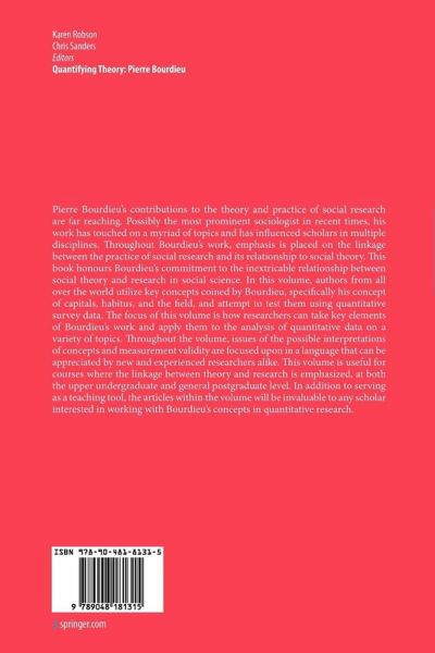 The focus of this volume is how researchers can take key elements of Bourdieu's work and apply them to the analysis of quantitative data on a variety of topics. Throughout the volume, issues of the possible interpretations of concepts and measurement validity are focused upon in a language that can be appreciated by new and experienced researchers alike. This volume is useful for courses where the linkage between theory and research is emphasized, at both the upper undergraduate and general postgraduate level. In addition to serving as a teaching tool, the articles within the volume will be invaluable to any scholar interested in working with Bourdieu's concepts in quantitative research.