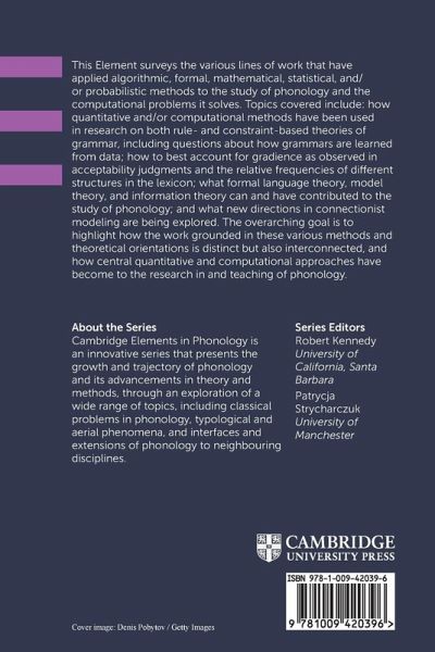 This Element surveys various lines of work to the study of phonology, on quantitative and computational approaches. It explores rule- and constraint-based grammar theories, data learning, gradience, formal language theory, model theory, and information theory. It covers the interconnectedness of these approaches in phonology research and teaching.