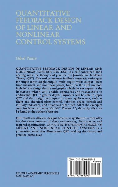 Quantitative Feedback Design of Linear and Nonlinear Control Systems is a self-contained book dealing with the theory and practice of Quantitative Feedback Theory (QFT). The author presents feedback synthesis techniques for single-input single-output, multi-input multi-output linear time-invariant and nonlinear plants based on the QFT method. Included are design details and graphs which do not appear in the literature, which will enable engineers and researchers to understand QFT in greater depth. Engineers will be able to apply QFT and the design techniques to many applications, such as flight and chemical plant control, robotics, space, vehicle and military industries, and numerous other uses. All of the examples were implemented using Matlab® Version 5.3; the script file can be found at the author's Web site.