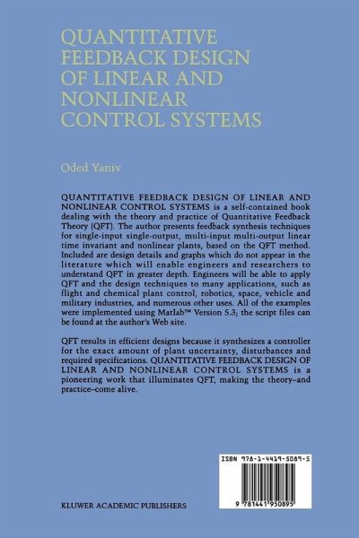 Quantitative Feedback Design of Linear and Nonlinear Control Systems is a self-contained book dealing with the theory and practice of Quantitative Feedback Theory (QFT). The author presents feedback synthesis techniques for single-input single-output, multi-input multi-output linear time-invariant and nonlinear plants based on the QFT method. Included are design details and graphs which do not appear in the literature, which will enable engineers and researchers to understand QFT in greater depth. Engineers will be able to apply QFT and the design techniques to many applications, such as flight and chemical plant control, robotics, space, vehicle and military industries, and numerous other uses. All of the examples were implemented using Matlab® Version 5.3; the script file can be found at the author's Web site.
