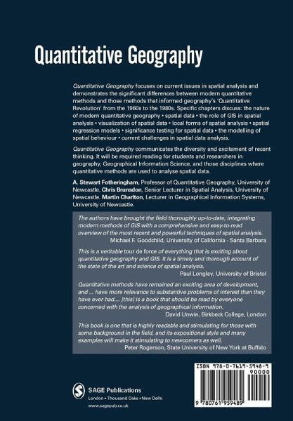 `This is a veritable tour de force of everything that is exciting about quantitative geography and GIS. It is a timely, thorough and exciting account of the state of the art and science of spatial analysis' - Paul Longley, University of Bristol `A highly innovative and up-to-date text. It is unique in its coverage of the many developments that have taken place in the field over the past few years. The book is one that is highly readable and stimulating for those with some background in the field, and its expositional style and many examples will make it stimulating to newcomers as well' - Peter Rogerson, State University of New York at Buffalo `Brings the field thoroughly up to date, integrating modern methods of GIS with a comprehensive and easy-to-read overview of the most recent and powerful techniques of spatial analysis. The book will be valuable to students and researchers in any discipline that seeks to explore or explain phenomena in geographical context, and will make excellent reading for geographers, political scientists, criminologists, anthropologists, geologists, epidemiologists, ecologists, and many others. It offers a spirited challenge to critics of a scientific approach to social science, and demonstrates the value of its subject matter through abundant examples' - Michael Goodchild, National Center for Geographic Information and Analysis, University of California, Santa Barbara `There is a view within some parts of academic geography that what used to be called "quantitative geography" is dead, having been subsumed within "geographical information systems" or else of no continuing interest. This book should correct this view. First, it shows that quantitative methods have remained an exciting area of development and, second, it shows that, if anything, they have more relevance to substantive problems of interest than they have ever had. Although not specifically about GIS, it is a book that should be read by everyone concerned with the analysis of geographical information' - David Unwin, Birkbeck College, University of London