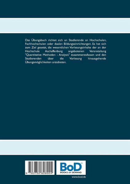 Das Übungsbuch richtet sich an Studierende an Hochschulen, Fachhochschulen oder dualen Bildungseinrichtungen. Es hat sich zum Ziel gesetzt, die wesentlichen Vorlesungsinhalte der an der Hochschule Aschaffenburg angebotenen Veranstaltung "Quantitative Methoden - Analysis" zusammenzufassen und den Studierenden über die Vorlesung hinausgehende Übungsmöglichkeiten anzubieten.
