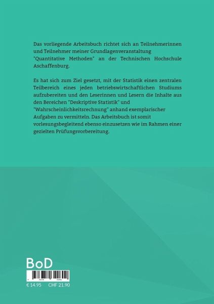 Das vorliegende Arbeitsbuch richtet sich an Teilnehmer meiner Grundlagenveranstaltung "Quantitative Methoden" an der Technischen Hochschule Aschaffenburg. Es hat sich zum Ziel gesetzt, mit der Statistik einen zentralen Teilbereich eines jeden betriebswirtschaftlichen Studiums aufzubereiten und den Lesern die Inhalte aus den Bereichen "Deskriptive Statistik" und "Wahrscheinlichkeitsrechnung" anhand exemplarischer Aufgaben zu vermitteln. Das Arbeitsbuch ist somit vorlesungsbegleitend ebenso einzusetzen wie im Rahmen einer gezielten Prüfungsvorbereitung.