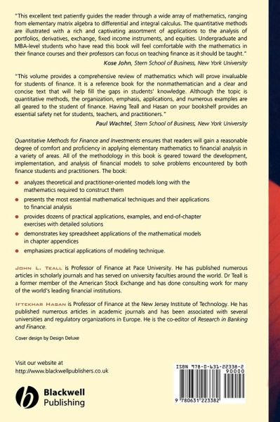 "This volume provides a comprehensive review of mathematicswhich will prove invaluable for students of finance. It is areference book for the nonmathematician and a clear and concisetext that will help fill the gaps in students' knowledge. Althoughthe topic is quantitative methods, the organization, emphasis,applications, and numerous examples are all geared to the studentof finance. Having Teall and Hasan on your bookshelf provides anessential safety net for students, teachers, and practitioners."Paul Wachtel, Stern School of Business, New YorkUniversity