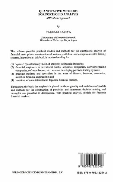 Quantitative Methods for Portfolio Analysis provides practical models and methods for the quantitative analysis of financial asset prices, construction of various portfolios, and computer-assisted trading systems. In particular, this book is required reading for: (1) `Quants' (quantitatively-inclined analysts) in financial industries; (2) financial engineers in investment banks, securities companies, derivative-trading companies, software houses, etc., who are developing portfolio trading systems; (3) graduate students and specialists in the areas of finance, business, economics, statistics, financial engineering; and (4) investors who are interested in Japanese financial markets. Throughout the book the emphasis is placed on the originality and usefulness of models and methods for the construction of portfolios and investment decision making, and examples are provided to demonstrate, with practical analysis, models for Japanese financial markets.