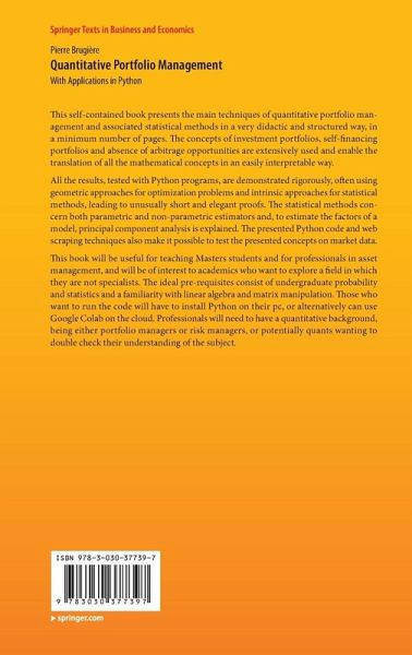This self-contained book presents the main techniques of quantitative portfolio management and associated statistical methods in a very didactic and structured way, in a minimum number of pages. The concepts of investment portfolios, self-financing portfolios and absence of arbitrage opportunities are extensively used and enable the translation of all the mathematical concepts in an easily interpretable way.