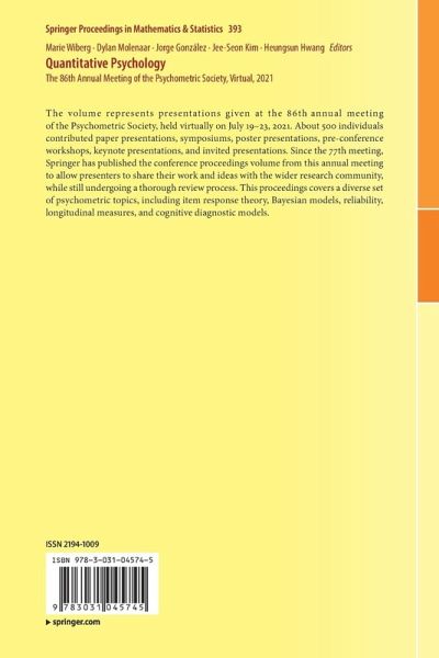 The volume represents presentations given at the 86th annual meeting of the Psychometric Society, held virtually on July 19-23, 2021. About 500 individuals contributed paper presentations, symposiums, poster presentations, pre-conference workshops, keynote presentations, and invited presentations. Since the 77th meeting, Springer has published the conference proceedings volume from this annual meeting to allow presenters to share their work and ideas with the wider research community, while still undergoing a thorough review process. This proceedings covers a diverse set of psychometric topics, including item response theory, Bayesian models, reliability, longitudinal measures, and cognitive diagnostic models.