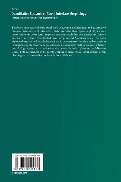 Introduction.- Part 1: Street interface in historical and regional context.- Chapter 1: The historical evolution of street interface in Chinese cities.- Chapter 2: The historical evolution of street interface in European cities.- Chapter 3: The comparison of street interface between Chinese and Western Cities.- Part 2: Quantitative method of street interface morphology.- Chapter 4: Review of qualitative research on street morphology.- Chapter 5: Review of quantitative research on street morphology.- Chapter 6: Constructing quantitative method on street interface morphology.- Part 3: Empirical application of quantitative method.- Chapter 7: Street interface density.- Chapter 8: Build-to-line ratio and Near-line ratio.- Chapter 9: Integrated application.- Conclusion.