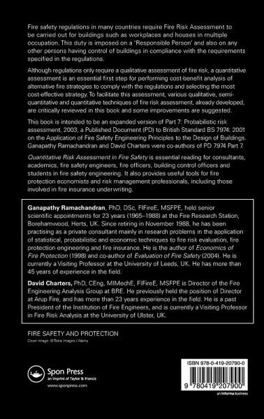 Ganapathy Ramachandran, PhD, DSc, FIFireE, MSFPE, held senior scientific appointments for 23 years (1965-1988) at the Fire Research Station, Borehamwood, Herts, UK. Since retiring in November 1988, he has been practising as a private consultant mainly in research problems in the application of statistical, probabilistic and economic techniques to fire risk evaluation, fire protection engineering and fire insurance. He is the author of Economics of Fire Protection (1998) and co-author of Evaluation of Fire Safety (2004). He is currently a Visiting Professor at the University of Leeds, UK. He has more than 45 years of experience in the field. David Charters, PhD, CEng, MIMechE, FIFireE, MSFPE is Director of the Fire Engineering Analysis Group at BRE. He previously held the position of Director at Arup Fire, and has more than 23 years experience in the field. He is a past president of the Institution of Fire Engineers, and is currently a Visiting Professor in Fire Risk Analysis at the University of Ulster, UK.