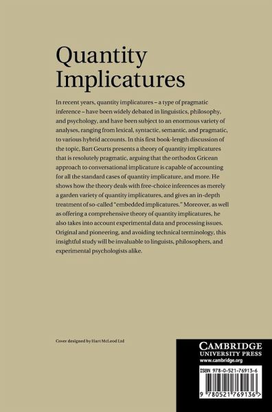 In recent years, quantity implicatures - a type of pragmatic inference - have been widely debated in linguistics, philosophy, and psychology, and have been subject to an enormous variety of analyses, ranging from lexical, syntactic, semantic, and pragmatic, to various hybrid accounts. In this first book-length discussion of the topic, Bart Geurts presents a theory of quantity implicatures that is resolutely pragmatic, arguing that the orthodox Gricean approach to conversational implicature is capable of accounting for all the standard cases of quantity implicature, and more. He shows how the theory deals with free-choice inferences as merely a garden variety of quantity implicatures, and gives an in-depth treatment of so-called 'embedded implicatures'. Moreover, as well as offering a comprehensive theory of quantity implicatures, he also takes into account experimental data and processing issues. Original and pioneering, and avoiding technical terminology, this insightful study will be invaluable to linguists, philosophers, and experimental psychologists alike.